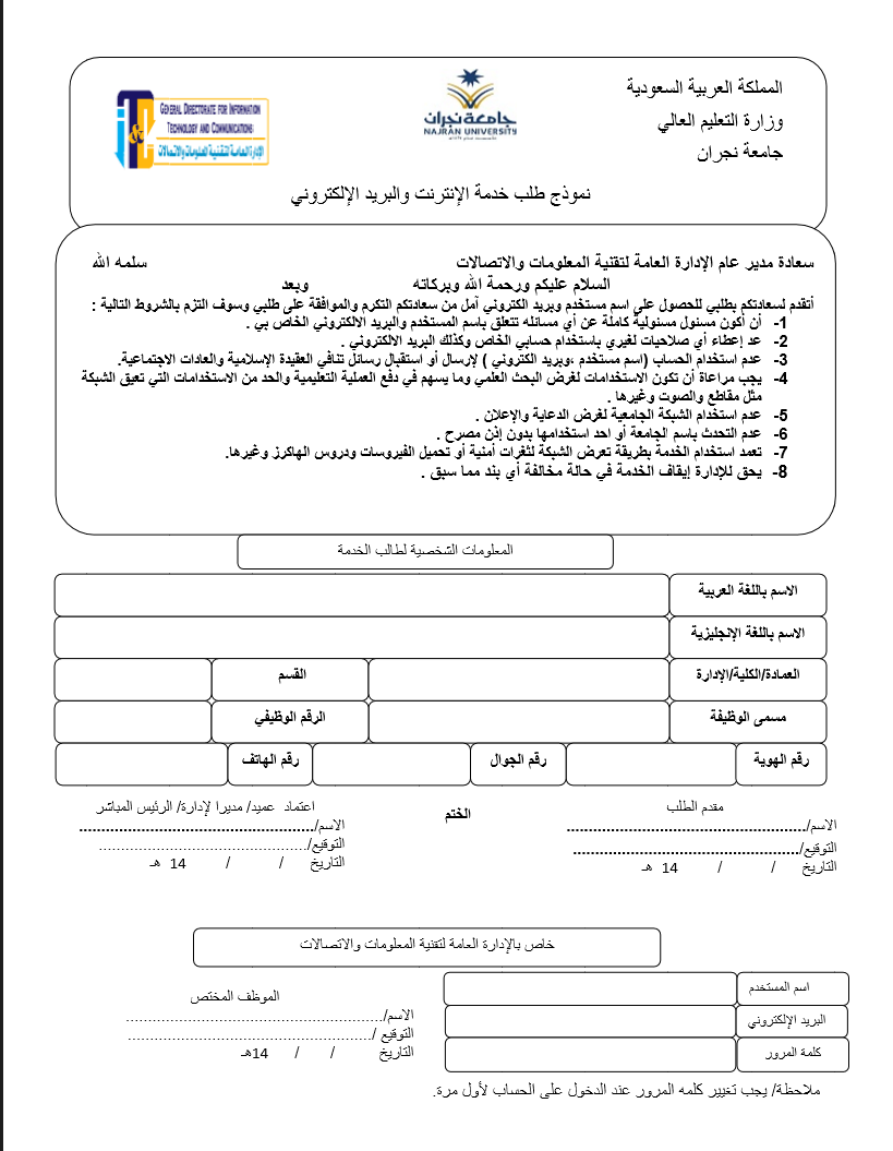 بعد فتح النموذج يمكنك طباعتة وتعبئة بياناتك الشخصية مع اعتماد المدير المباشر بعد ذلك يمكنك إرساله إلى تقنية المعلومات عن طريق نظام الإتصالات الإدارية للتنفيذ