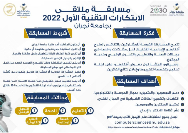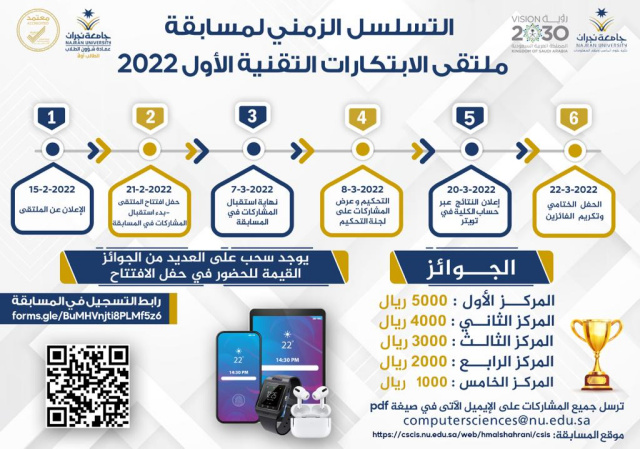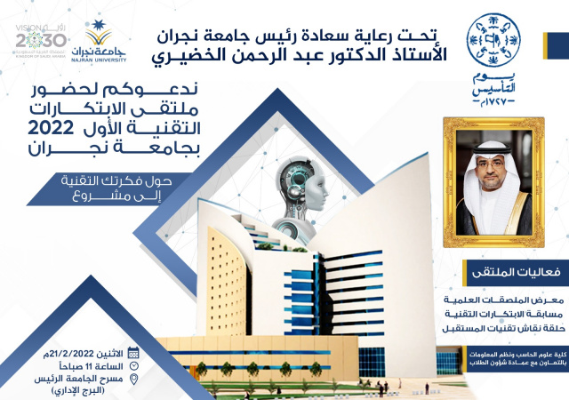 The College of Computer Science and Information Systems - represented by the Student Activities and Scientific Research Units in cooperation with the Deanship of Student Affairs at the university - launched the first Technical Innovations Forum 2022, under the sponsorship of the President of the University, Prof. Abdulrahman bin Ibrahim Al-Khudairi.