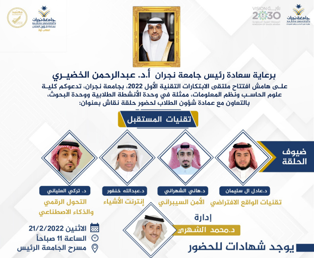 The forum includes an exhibition of the scientific posters, presenting the projects of the students at the College of Computer Science and Information Systems. Such activity offers an opportunity to develop the soft skills of the participating students, develop their projects, and spread the spirit of competition among them. In addition, there is a discussion panel entitled “Future Technologies” in which some faculty members of the College of Computer Science and Information Systems will participate.